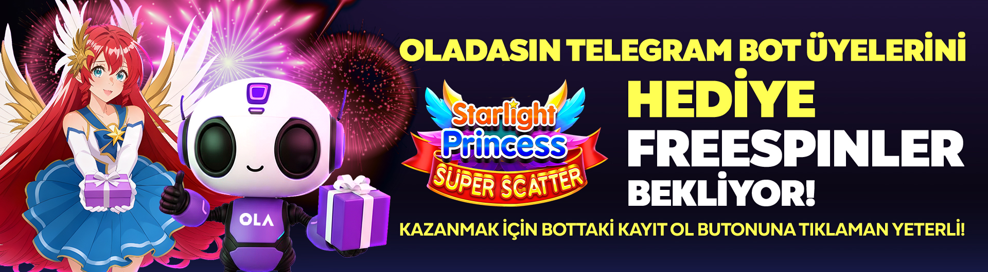 ★ Oladasın Telegram Bot’a kayıt olan tüm üyelerimiz 50 adet Starlight Princess Super Scatter freespin kazanacak olup, spin değeri 2 TL’dir.